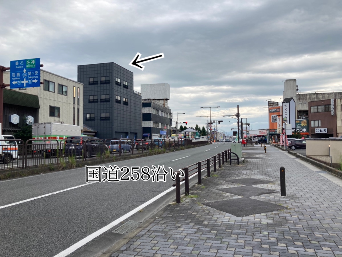 国道沿いにあり、屋上4階からは大垣市民病院が見えます。