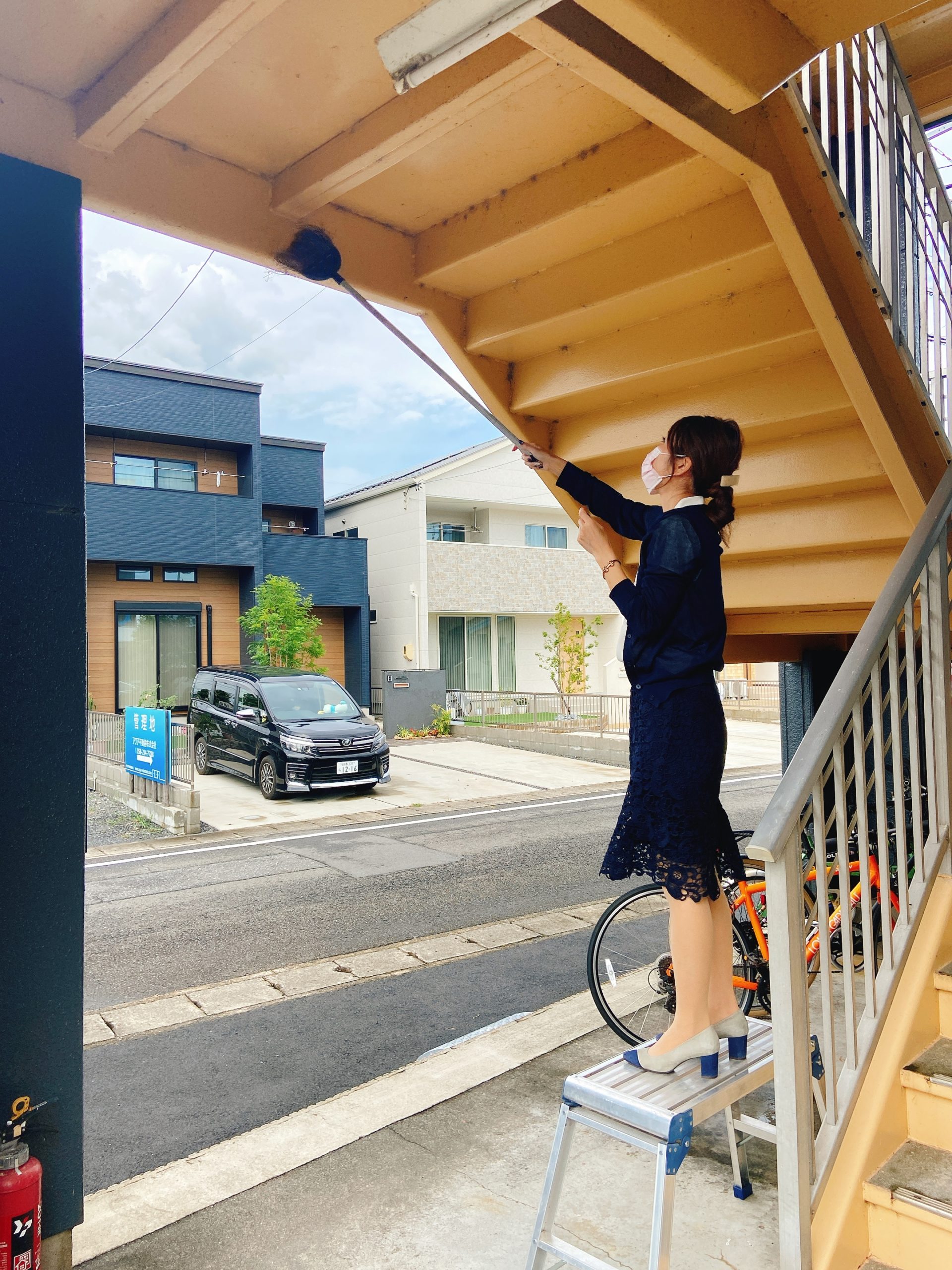 階段裏は届かないので脚立を使います