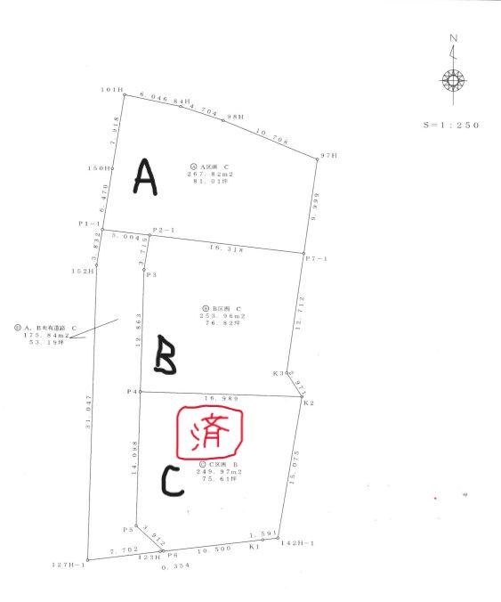 差し込み道路はAB共有道路175.84㎡(53.19坪)となります。